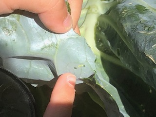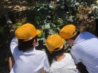 今日は、キャベツ畑で、たまごや幼虫がいないか、虫めがねをもって探しました。