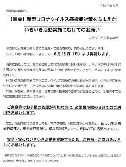 大阪市こども青少年局から、『新型コロナウイルス感染症対策をふまえたいきいき活動実施にむけてのお願い』の連絡がありましたのでお知らせします。