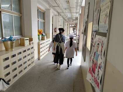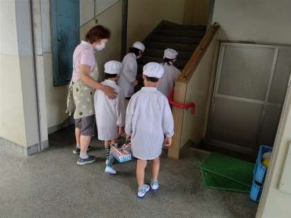 給食当番の子どもたちが、協力して食缶と牛乳を運んでくれています。