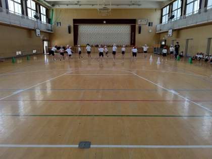 体育館では、ライン上に立ちふさがる守りの児童の間を