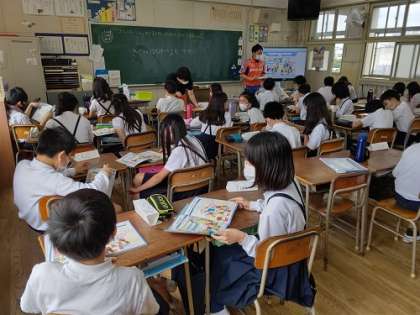 東淀中学校より英語担当の先生が、豊里小学校の高学年に英語の授業に来てもらっています。ふたリペアーになって、英語でコミュニケーションをとる練習をしています。