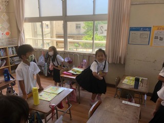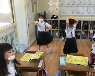 今日の1年生の音楽は、曲に合わせて体で表現しています。