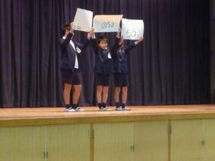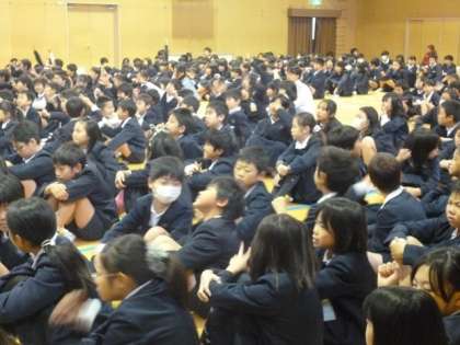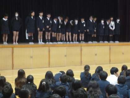 今朝は体育館での児童集会、「新聞委員」の発表です。