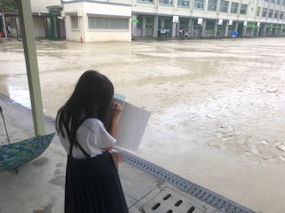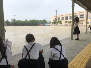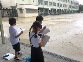 今日みたいに大雨だと、運動場にたくさんの小さい川ができて、しっかりと学習できますね。