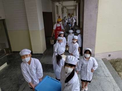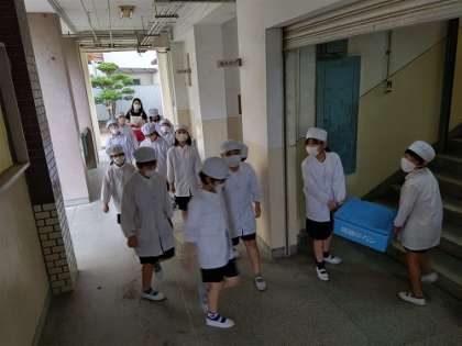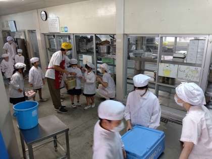 出来立ての給食を各学級まで、給食当番の児童が運んでいます。