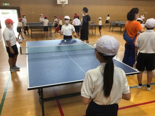卓球クラブは、さっそく実践練習です。はじめてする子も、ラリーを続けようと必死で頑張っています。