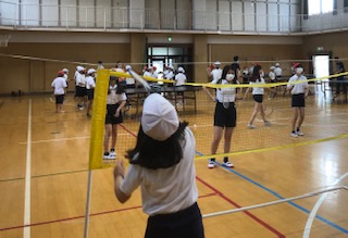バドミントンクラブは、ネットを挟んでラリーを続けています。10回以上続けているペアもいました。
