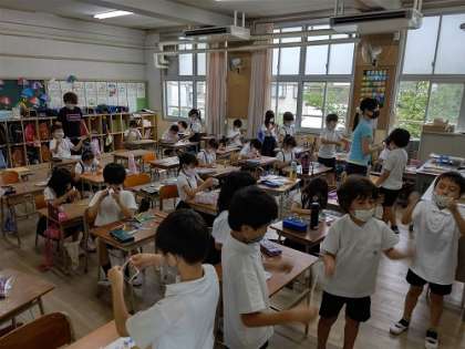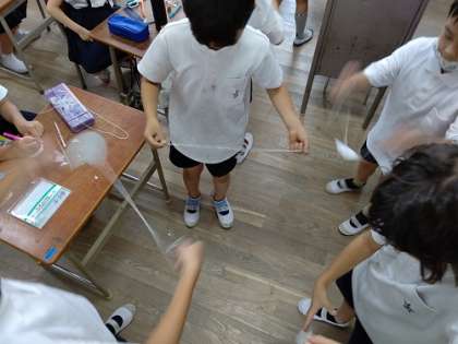 自分で作った紙の作品をタコ糸で両方から引っ張ってよじり、戻るときの力を回転に変えています。