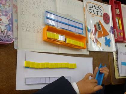 ○身の回りのものを基準量として長さを計り、数値化することを通して測定の基準を理解することができる。