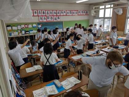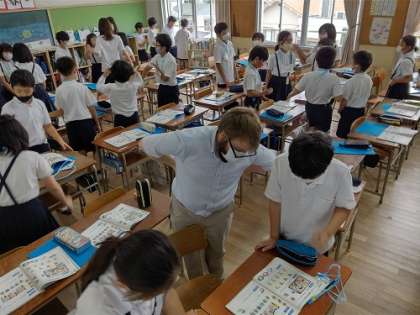 C−NETのウィック先生と一緒に、グループごとに英語でディスカッションをしています。