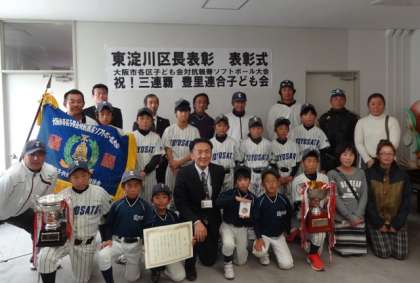 大阪市各区子ども会対抗親善ソフトボール大会の三連覇の偉業を祝し、東淀川区役所への表敬訪問を行い、金谷東淀川区長から表彰状を授与されました。