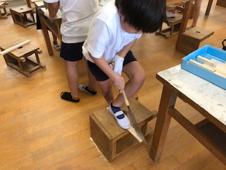 図工室をのぞいてみると、のこぎりで木材を切っています。
