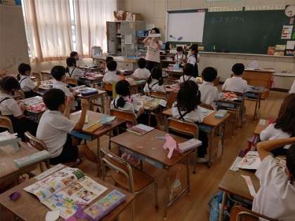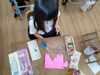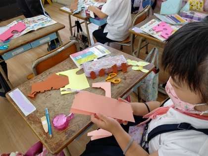 色画用紙を折ってデザインを切り抜き立ててみると、何が出来上がるかな。