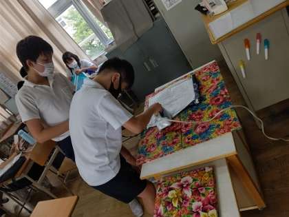 ナップザックが完成までもう少し。アイロンがけも上手です。