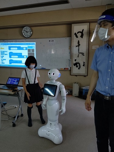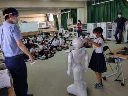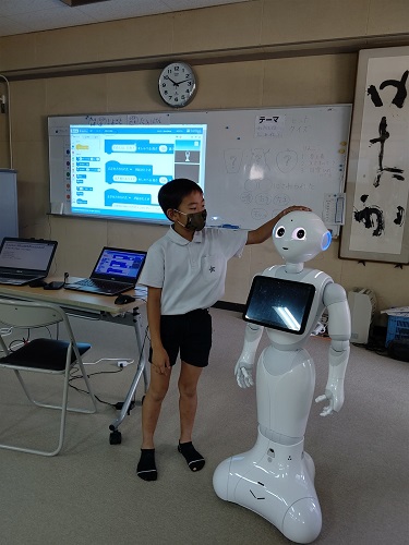 ペッパーは昨年きてくれていたものから、進化しているようです。「頭」も「手の甲」も「足のバンパー」もセンサーになっているようで、さわってあげると反応してくれます。