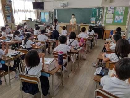 透明の容器が二つあります。立方体と円柱の容器です。さて、どちらが多く水が入るでしょうか?というところの質問から、どうやって比べるといいのかをみんなで考えています。
