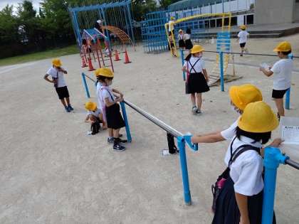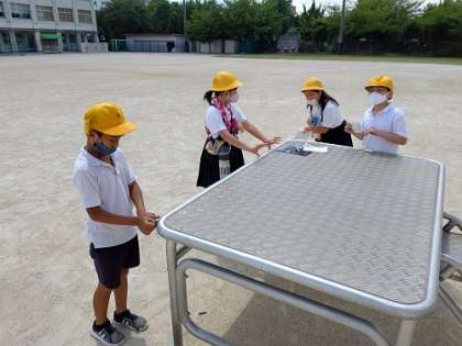 運動場の朝礼台や鉄棒や遊具のいろいろな長さを計っています。