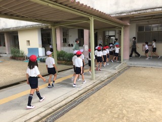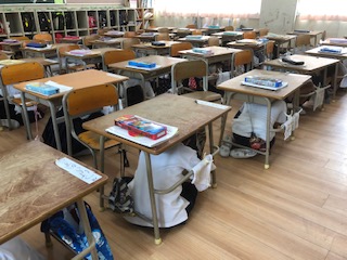 通常通りの授業を受けていた児童は、先生の指示に従って、すぐに机の下に潜り込みました。