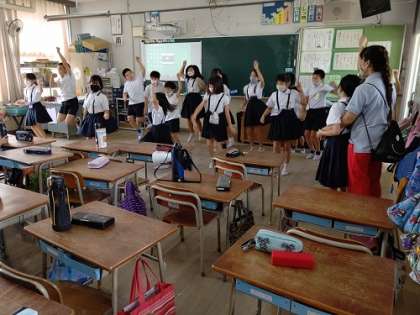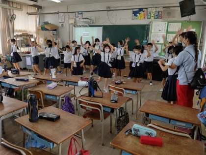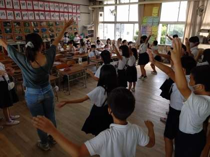 「ABCダンス」の振り付けと英語の歌詞を覚えて、曲に合わせてダンスの練習です。