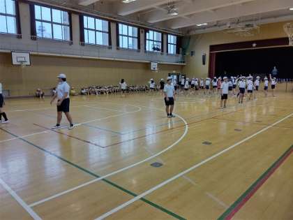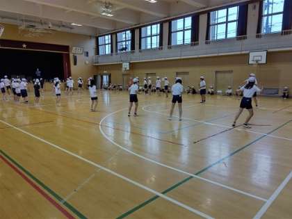 雨で運動場が使えないため、体育館でダンスの練習をしています。