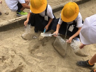 みんなが砂をつめこんだら、一人ずつはかりで量ります。
