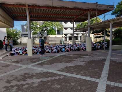 門前のピロティに集合して、出発式です。