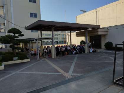 門前のピロティに集合してしています。