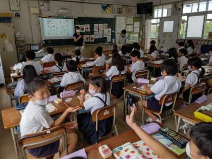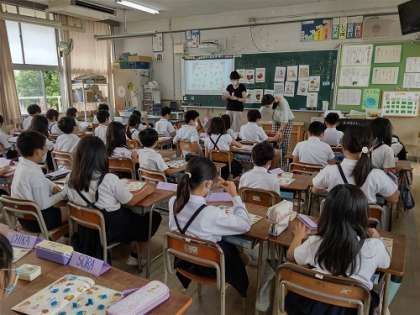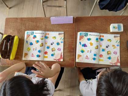 C−NETのアナ先生と「What do you like ?」の内容で、教科書の上でおはじきゲームをしています。