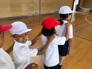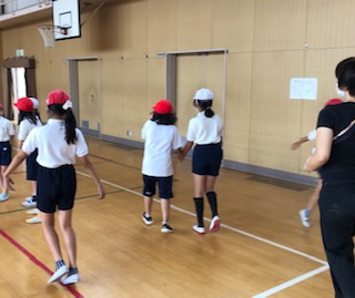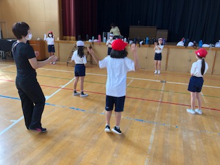講堂で、パプリカをおどりました。リズムに合わせて、楽しくおどりました。