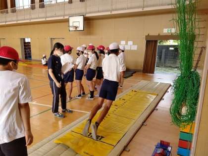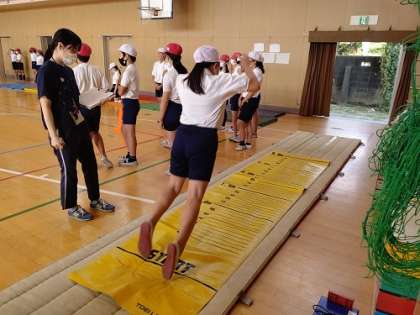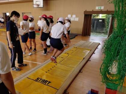 体育館でスポーツテストをしています。