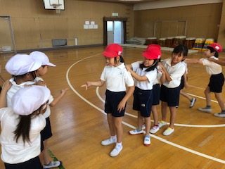 講堂では、昆虫太極拳、じゃんけん列車、スキップリレーをしました。