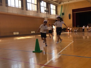 スキップリレーは、上手にスキップしながら三角コーンをまわってきます。競争というよりも、上手にスキップしながら次の人につないでいきます。