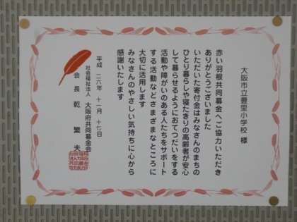 大阪府共同募金会からの感謝状は職員室前の掲示板に掲示しています。