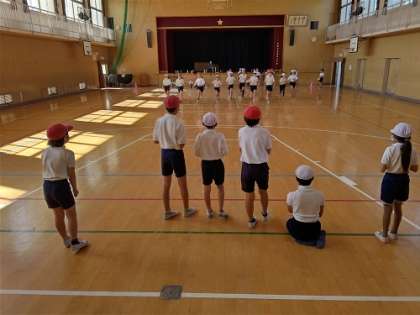 体育館では、スポーツテストの「シャトルラン」が行われています。