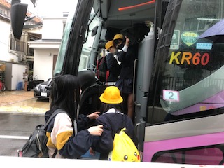 出発式の後、クラスごとにバスにのりこみました。