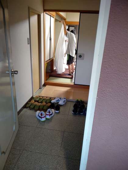 シーツをたたんでます。体操服に着替えています。担任の先生は、子どもの検温にまわっています。