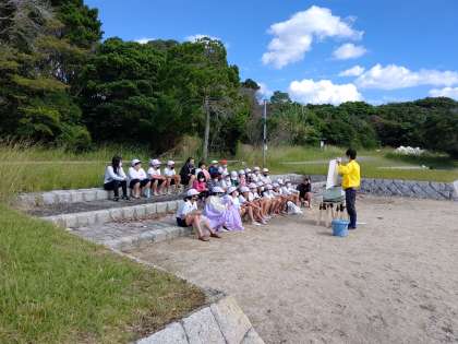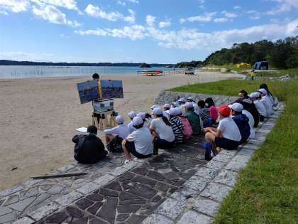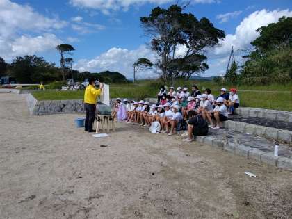 後半の班の磯観察のグループが、水族館の方と学習しています。