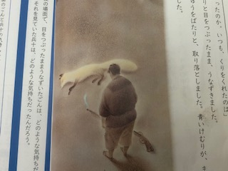 学習のめあては、「最後にうなずいたごんは、兵十に何を伝えたかったかを考えよう」です。最後の場面です。