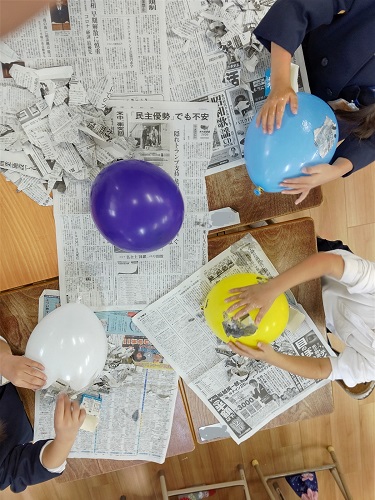 風船にのりでちぎった新聞紙を貼っています。