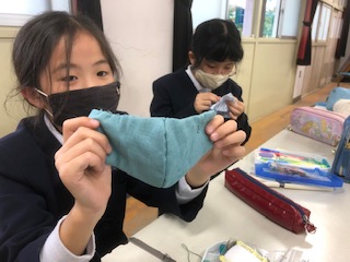 マスクを作っている子、手さげ袋を作っている子、小物入れを作っている子など様々です。