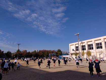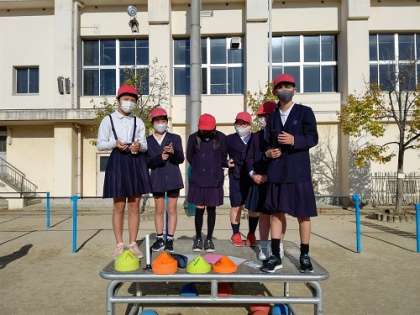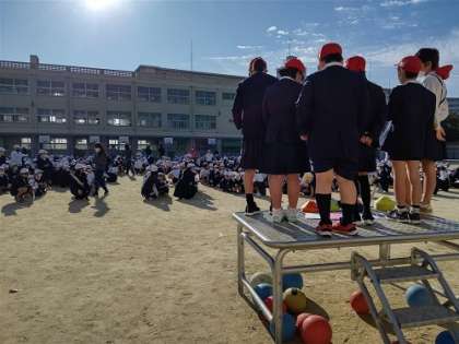 今年度、初めての児童集会を運動場で行いました。朝礼台の上で集会委員会の児童が、号令をかけてくれました。