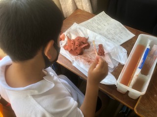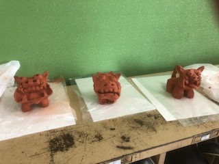 土に水をつけ、手でこねたり、指でつまんだりしてシーサーの形を作っていきます。