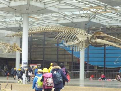 先ずは、敷地内にある「自然史博物館」を見学、エントランスで待ち構えている大きな大きなクジラの標本にびっくりです。