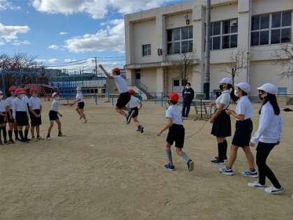 大縄跳びで、連続で42人の子どもたちが跳んでいました。
