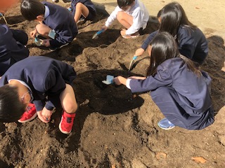 2年1組の児童が、学習園で、スコップを持って何かを植えています。
