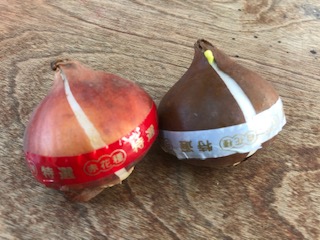 球根には、赤や白、黄、紫などのテープが貼ってあります。