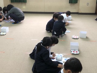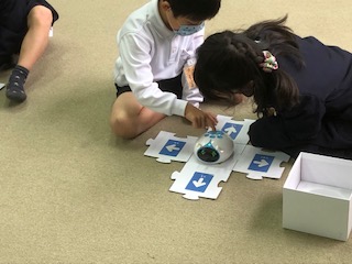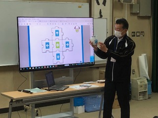 先週に引き続き、今日は、校長先生が1年生にプログラミング学習の指導をしてくださいました。