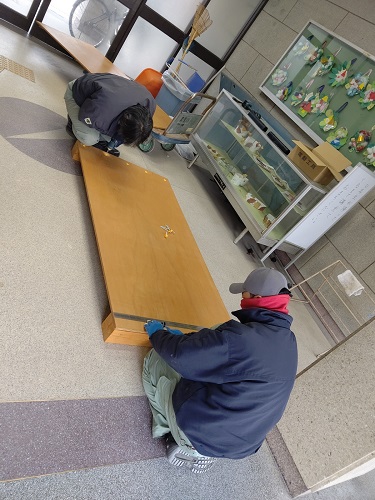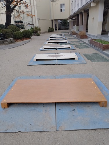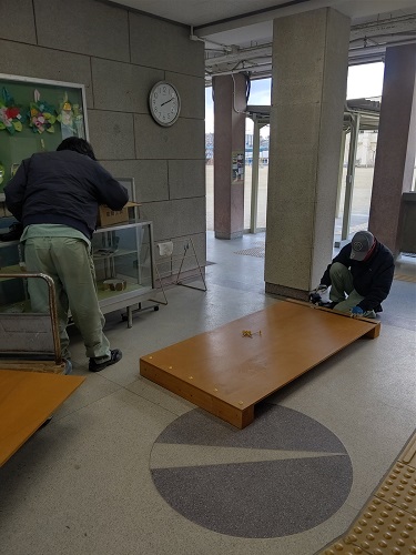 管理作業員さんが作ってくれいた「なわとびジャンプ台」がいよいよ完成し、取り付けの作業をしてくれています。