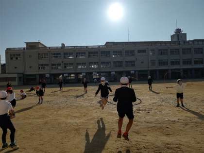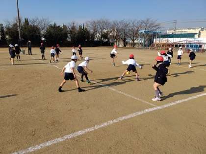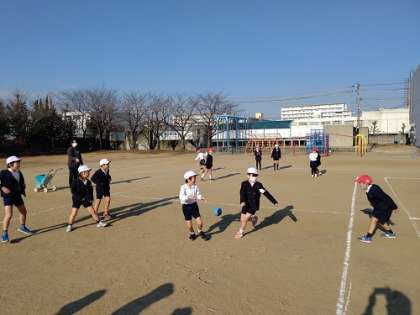 運動場で体育です。ドッジボールを頑張っています。