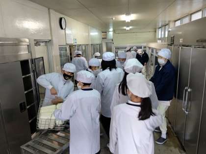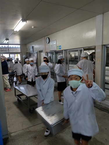 給食室から教室まで、各クラスの給食当番が運びます。